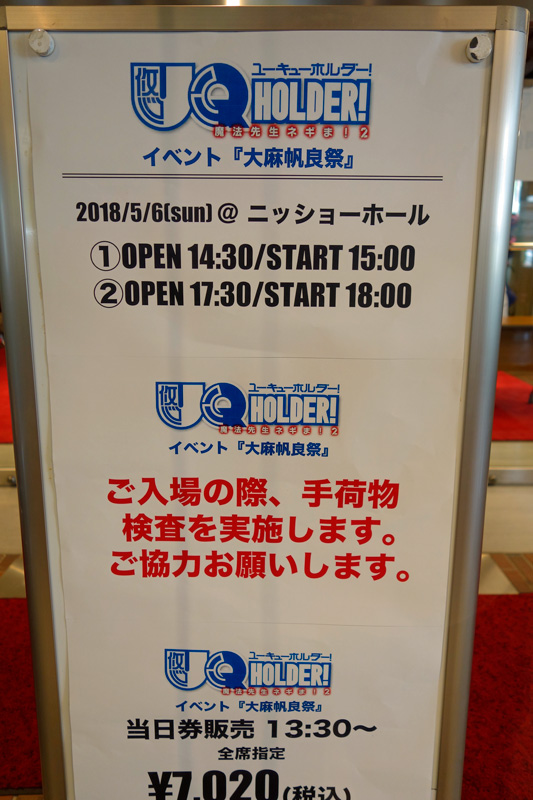 大麻帆良祭「UQ HOLDER!~魔法先生ネギま!2~」Ver の会場は、港区虎ノ門にある「ニッショーホール」です。